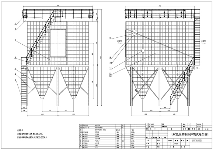 (1)鑄造廠電爐布袋除塵器 結(jié)構(gòu) 點 除塵器中部箱體為園形筒狀結(jié)構(gòu),設(shè)計壓力0.25MPa,材質(zhì)為Q345R,板厚14mm以上。其上設(shè): 檢修人孔。 箱體設(shè)氮氣吹掃系統(tǒng),用于qingchu積聚的灰塵和筒體煤氣置換吹掃; 高爐布袋除塵器 高爐布袋除塵器(2張) 儀表壓縮空氣系統(tǒng),用于閥門控制;設(shè)人工灰塵檢測口,方便取樣化驗。 懸掛式箱體支座。煤氣進(jìn)口接管設(shè)相應(yīng)導(dǎo)流配氣裝置。 高爐布袋除塵器頂部采用符合/T4746-2002標(biāo)準(zhǔn)要求的正橢圓形封頭,壁厚16mm以上,材質(zhì)Q345R。凈煤氣從箱體頂部接出,在封頭上設(shè)有anquan閥及放散管。 高爐布袋除塵器下部采用錐形灰斗,材質(zhì)Q345R,板厚14mm以上,錐形灰斗錐角為50°,確保灰塵順利排出。下錐體上設(shè)雙路蒸汽保溫盤管防止煤氣結(jié)露和粉塵結(jié)塊而影響排灰。灰斗上下高低灰位各設(shè)一個熱電阻檢測灰斗的灰位,并設(shè)有倉壁震動器兩套和氮氣吹掃管。 除塵器進(jìn)、出口管道分別設(shè)置全封閉式電動插板閥、氣動三偏心蝶閥、大拉桿波紋補(bǔ)償器、手孔。